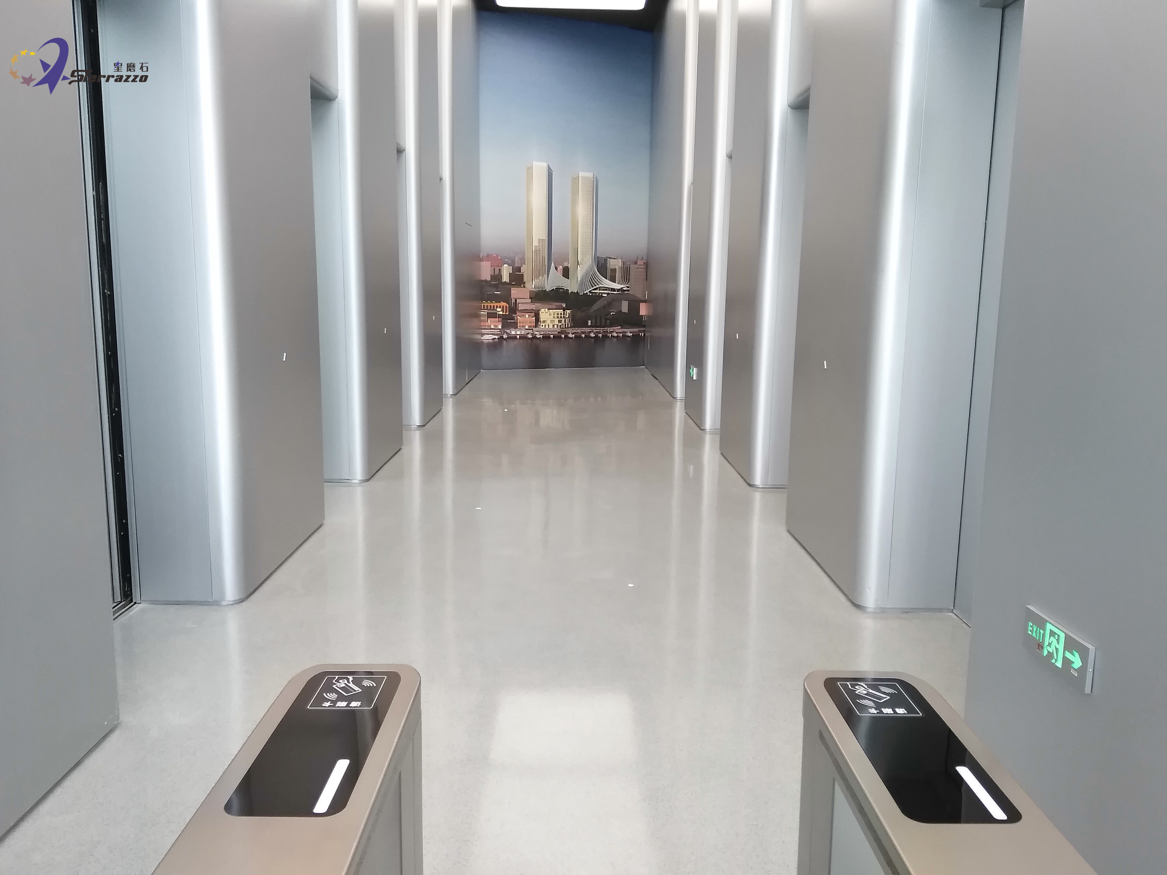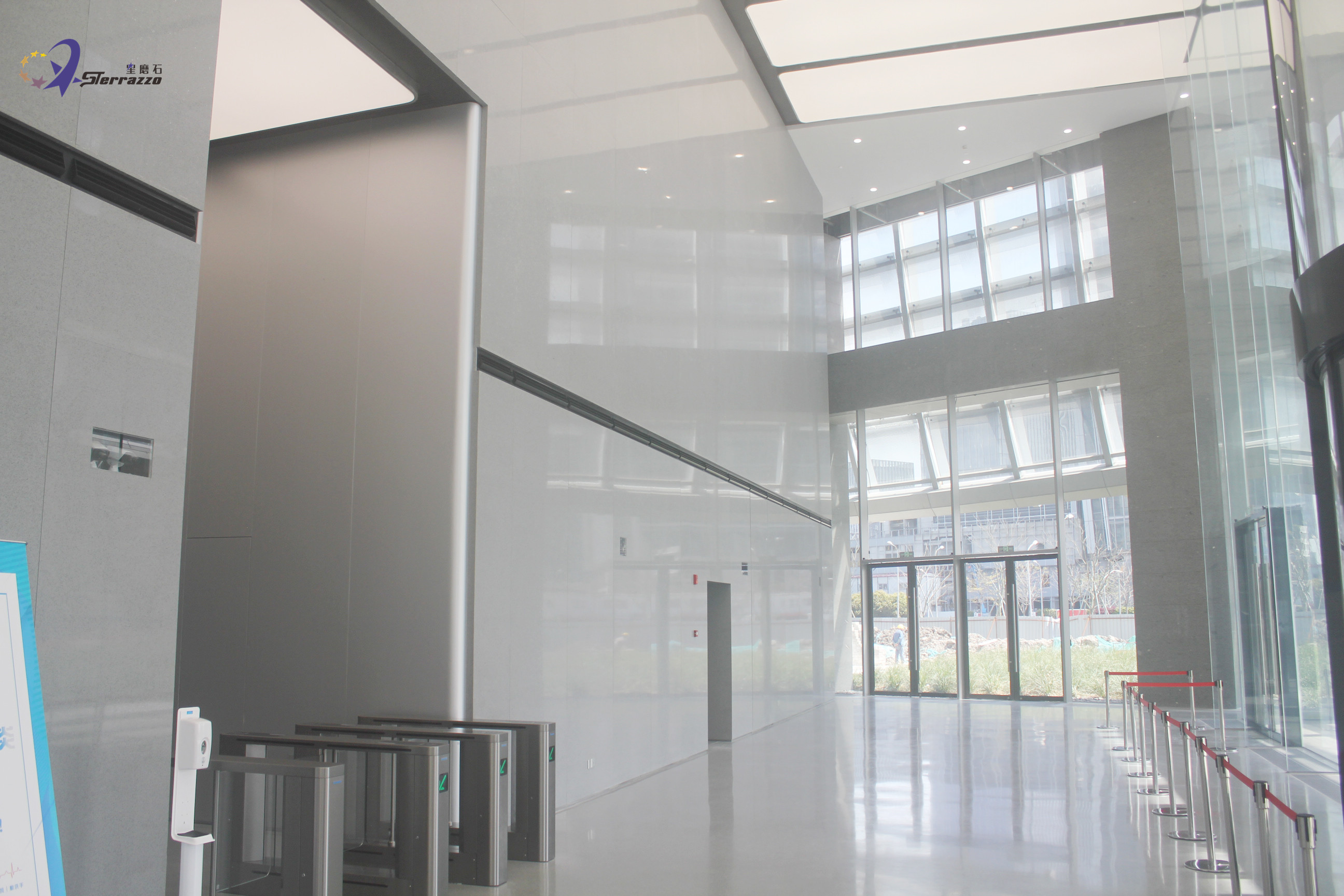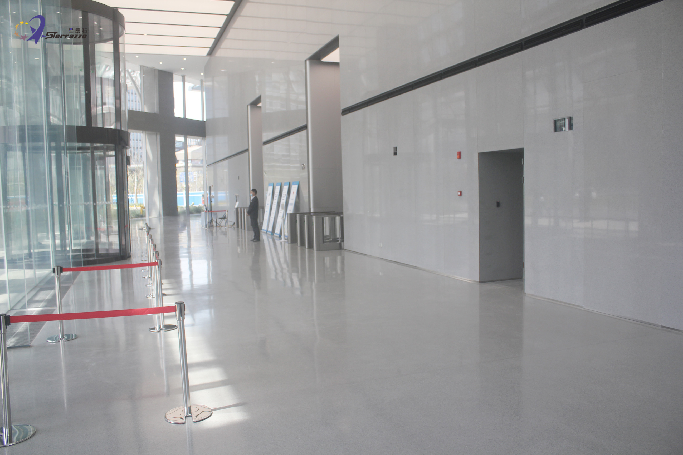 龙华国际中心位于徐汇滨江,以现代城市水岸景观营造为核心,巧妙融合黄浦江的辉煌历史与徐汇区的璀璨未来,全面打造一个集商务、酒店、商业、会展、休闲等多功能于一体的国际化城市综合体。龙华国际中心总建筑面积51万平方米,其中地上建筑面积超30万平方米,集国际甲级办公、机关办公、奢华五星酒店、时尚主题商业为一体。在设计中,如何把我们的艺术情结同装修材料恰当地融为一体,对设计者是一种考验。在龙华国际大厅,星磨石墙地一体的效果,把设计师想要的效果进行了完美的诠释!浅灰色是一种很有质感的颜色,它既不像黑色给我们的感觉,过于暗沉,也不像白色,亮度非常的高,这种介于中间的灰色用在这里设计会给我们一种很温和的感觉。浅灰色的墙地设计,加上白色顶灯,显得简约而又大气。