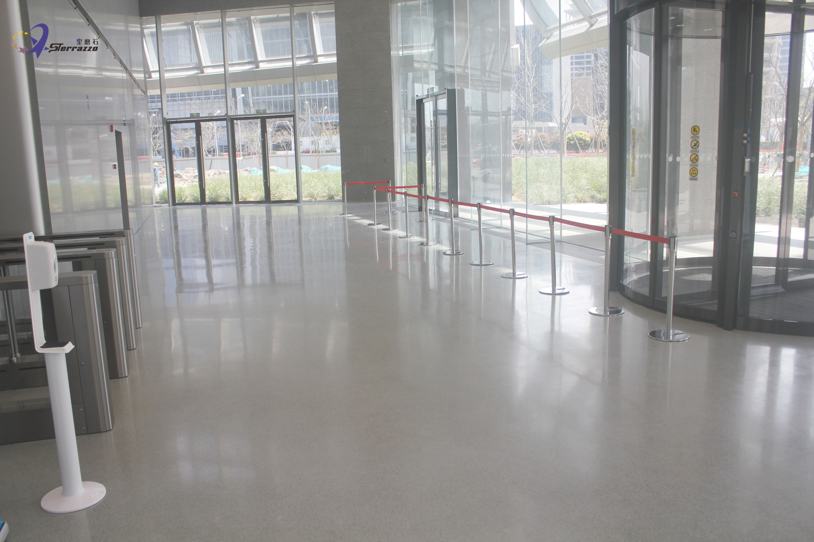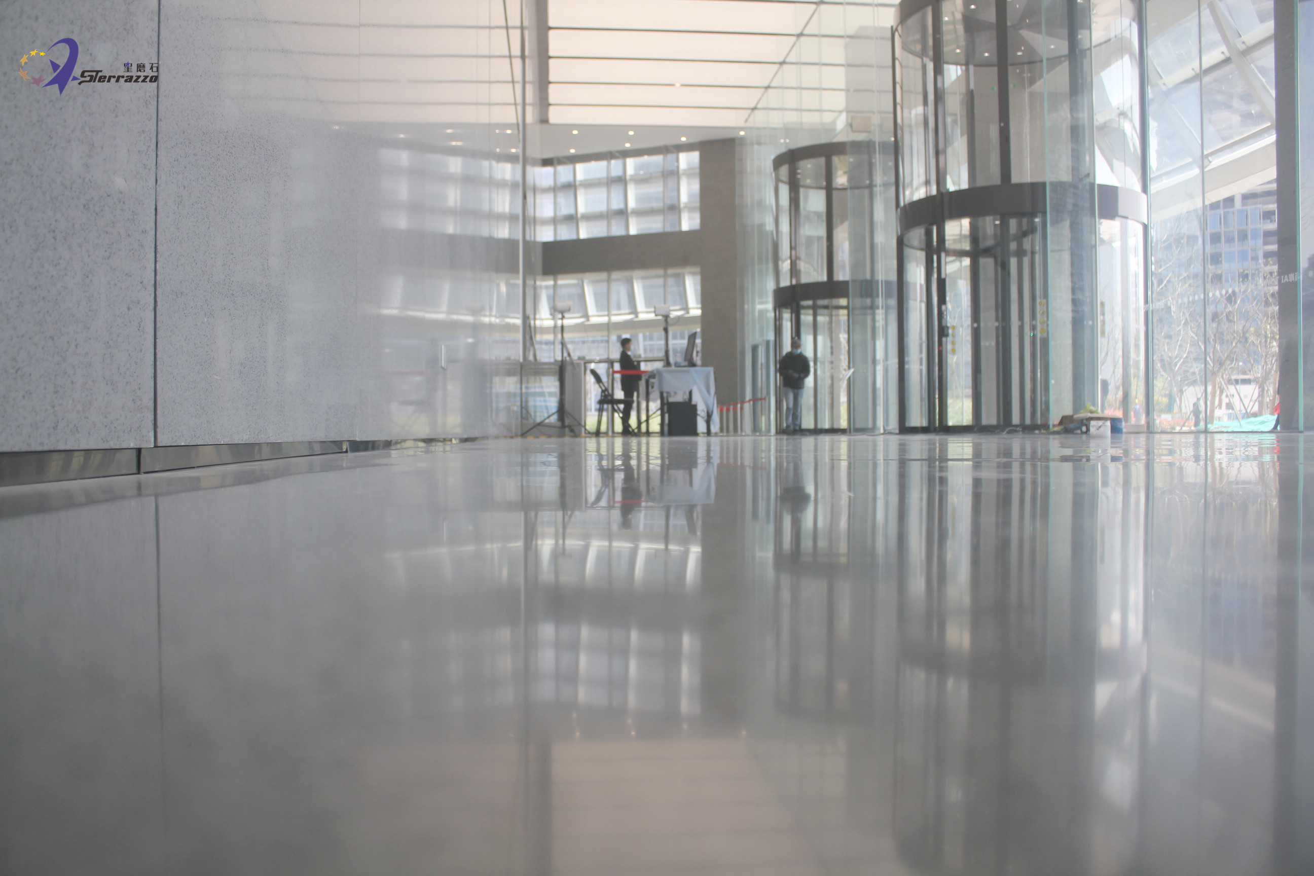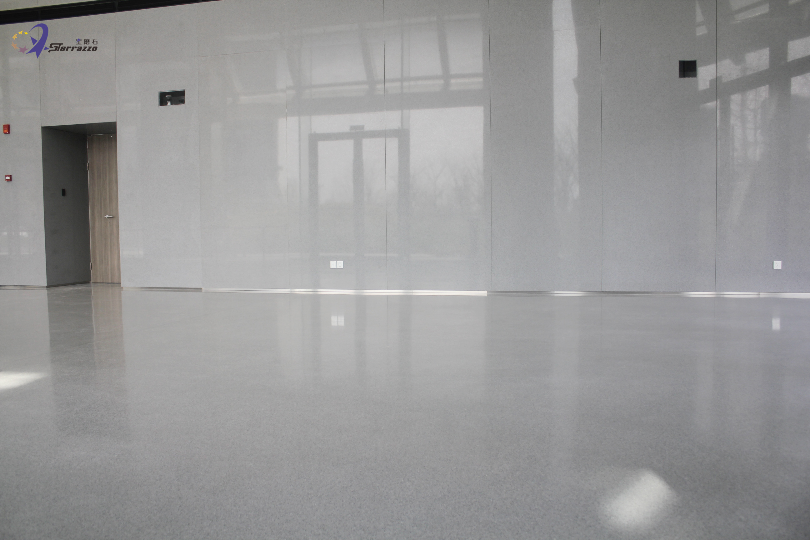 龙华国际中心位于徐汇滨江,以现代城市水岸景观营造为核心,巧妙融合黄浦江的辉煌历史与徐汇区的璀璨未来,全面打造一个集商务、酒店、商业、会展、休闲等多功能于一体的国际化城市综合体。龙华国际中心总建筑面积51万平方米,其中地上建筑面积超30万平方米,集国际甲级办公、机关办公、奢华五星酒店、时尚主题商业为一体。在设计中,如何把我们的艺术情结同装修材料恰当地融为一体,对设计者是一种考验。在龙华国际大厅,星磨石墙地一体的效果,把设计师想要的效果进行了完美的诠释!浅灰色是一种很有质感的颜色,它既不像黑色给我们的感觉,过于暗沉,也不像白色,亮度非常的高,这种介于中间的灰色用在这里设计会给我们一种很温和的感觉。浅灰色的墙地设计,加上白色顶灯,显得简约而又大气。
